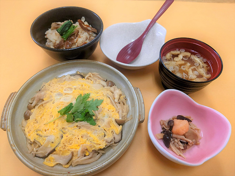 6種のきのこの卵とじ・きのこご飯・きのこの小付け・なめこ汁。まさに"きのこづくし"のメニューです。