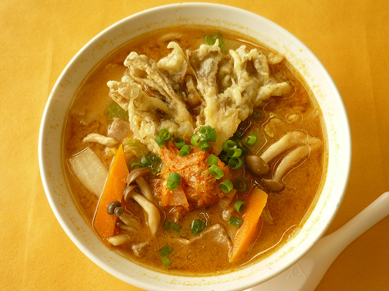 特製のピリ辛スープは具沢山なうどんと相性抜群!舞茸の天ぷらの香りをお楽しみください。