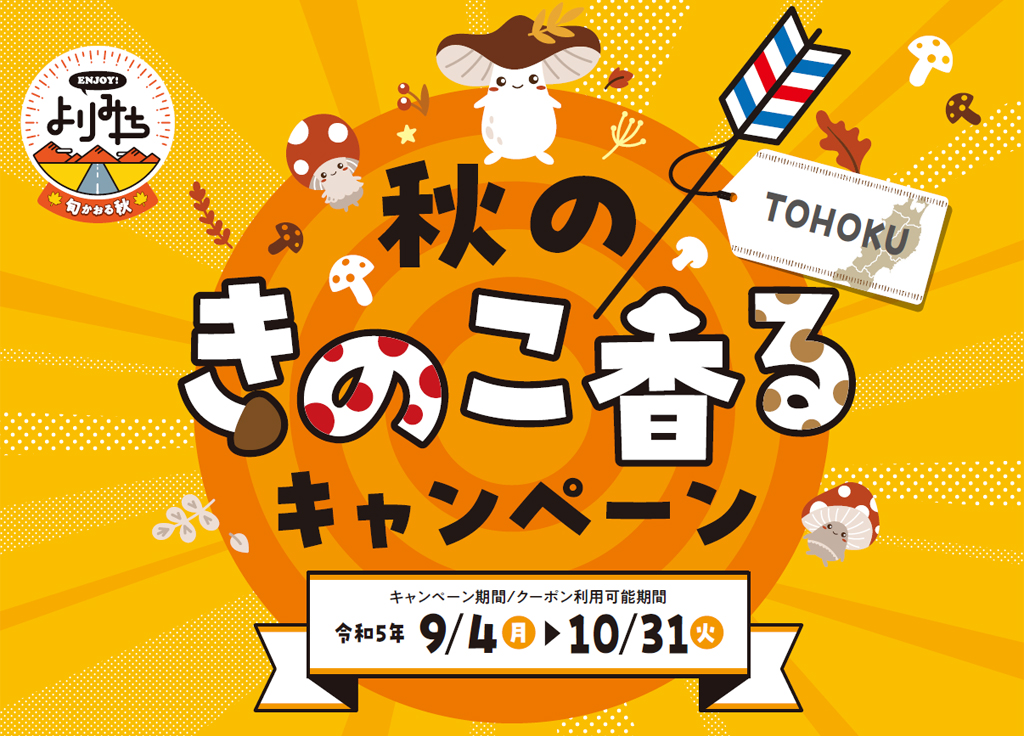 東北地方のSA・PAでは「きのこ」を使用した対象メニューをお召し上がりのお客さまにショッピングコーナーで使える電子クーポンが当たる「秋のきのこ香るキャンペーン」を開催中!!