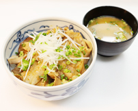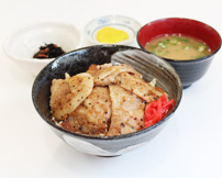 フードコート銘柄豚「もち豚」のロース肉を、ねぎ塩風味に味付けし、豪快に丼にのせたスタミナ満点な一品。にんにくの風味が食欲をそそります。お好みでレモンを絞ってお召し上がり下さい。