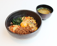 フードコート新潟県産の豚肉を使用した肉そぼろをメインに盛り付けた、彩り豊かなビビンバ丼です。ピリ辛のキムチやさっぱりとしたナムルと一緒に混ぜて食べるのがおすすめです!