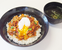 フードコート銘柄豚「越乃黄金豚」と地元で作った韓国キムチを炒めたスタミナ満点の豚キムチ丼。温泉卵を絡めるとまろやかになって、より一層箸が進みます。