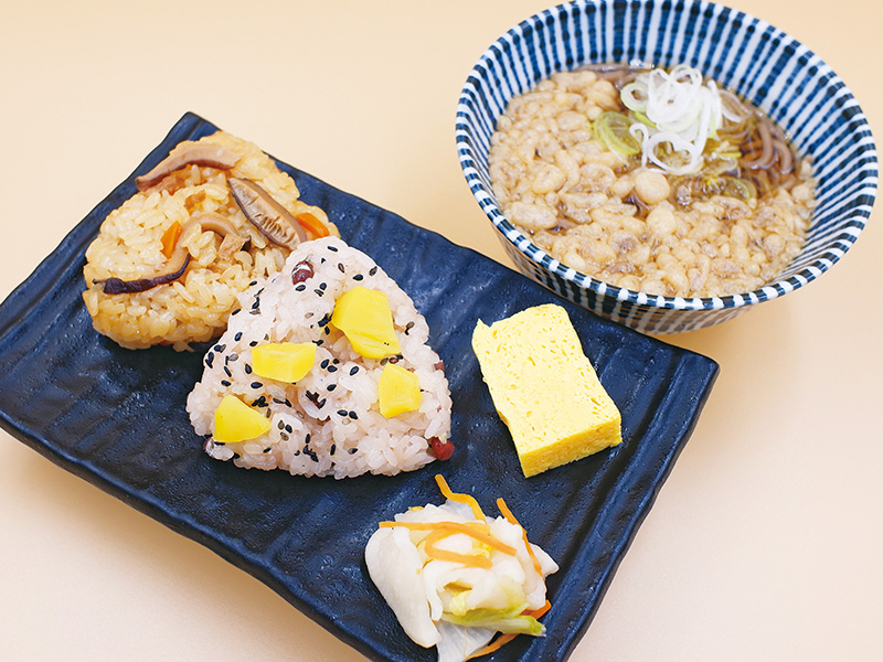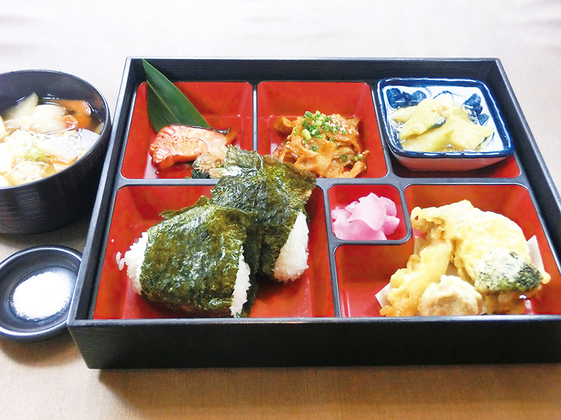 岩手県産「ひとめぼれ」の新米おにぎりと、地元食材のおかず3種を含んで幕の内弁当風に仕上げました。芋の子汁も付いて満足感たっぷり。