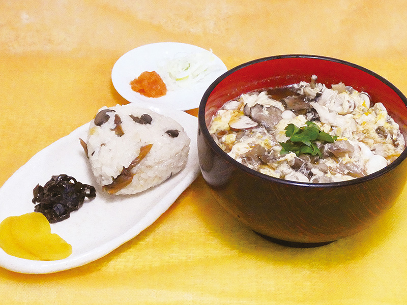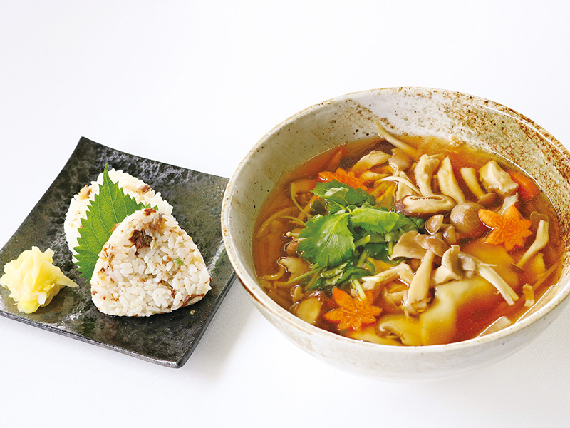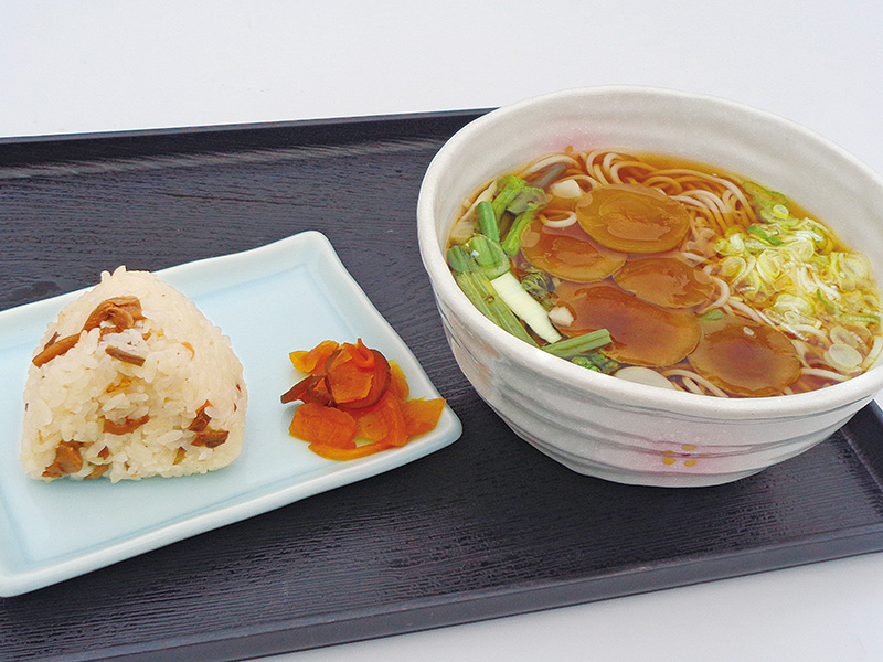 「だしきのこ」と称される程、旨味の強い出汁が出る「たもぎ茸」の炊き込みご飯おにぎりと、あっさり美味しい山菜なめこそばのセットです。