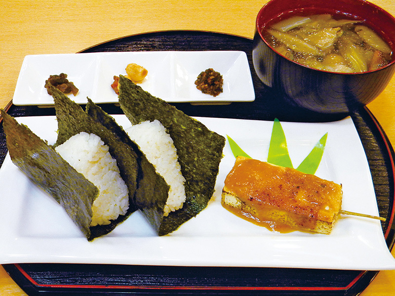 平泉の新米「ひとめぼれ」を味わう究極にシンプルな具なしおにぎりに、人気の3種の付け合わせと豆腐田楽、郷土料理のいものこ汁のセット。