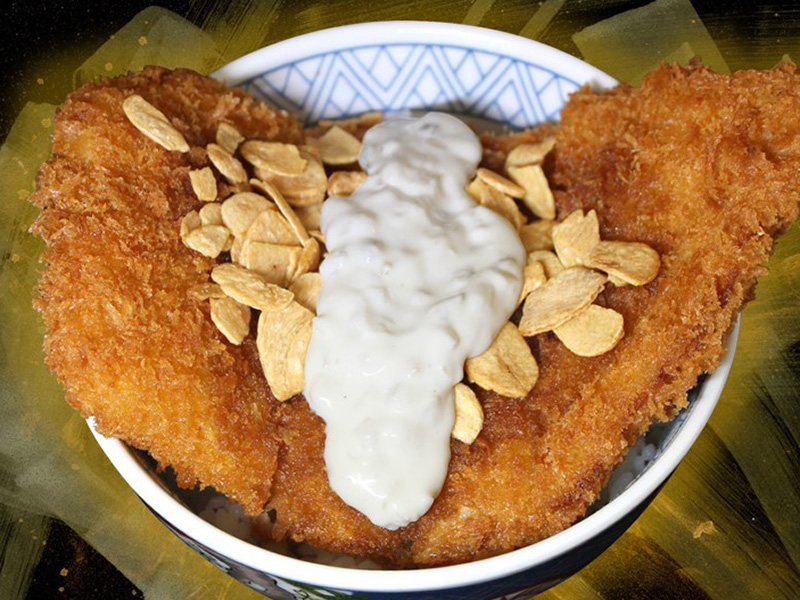 250gのジャンボチキンカツに油淋鶏だれとタルタルソース、サクサクのフライドガーリックでスタミナ満点!