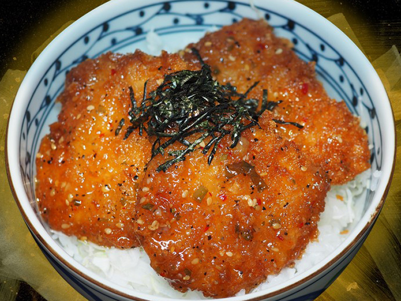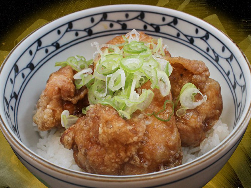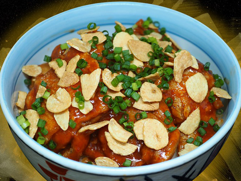 みんな大好き鶏のから揚げをヤンニョムチキンソースで丼にしました。ボリューム満点でおなか一杯になります。アクセントのガーリックも食欲をそそる甘辛なメニューです。