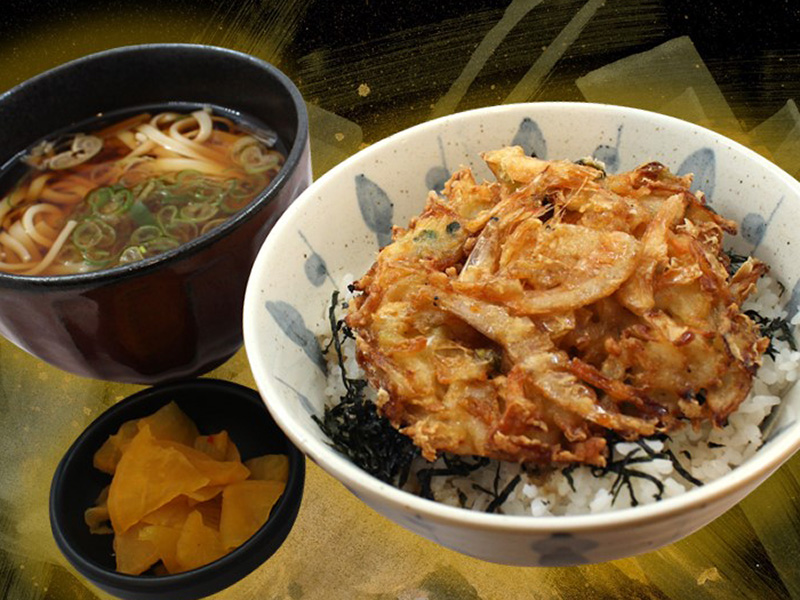 富山を代表する食材『白えび』のかき揚げ丼と、富山県のご当地グルメで日本3大うどん『氷見うどん』のセットメニューです。