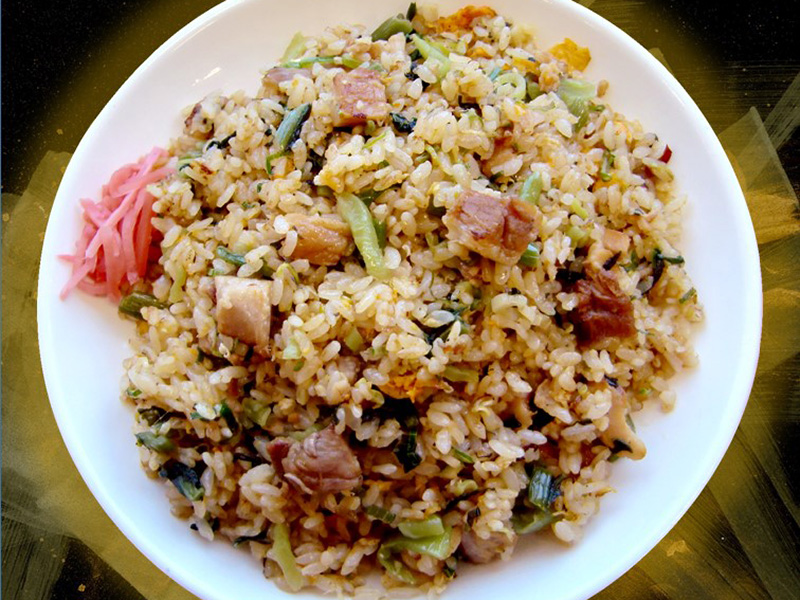 チャーシューがたっぷり入り、にんにくが食欲をそそる野沢菜スタミナチャーハン。ライスは大盛りで提供。ボリューム満点です!!