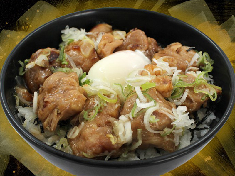 白米の上に焼き鳥(ももたれ)と卵を乗せた甘みのある贅沢な一品です。お好みに合わせて一味・黒胡椒をおつけ下さい。