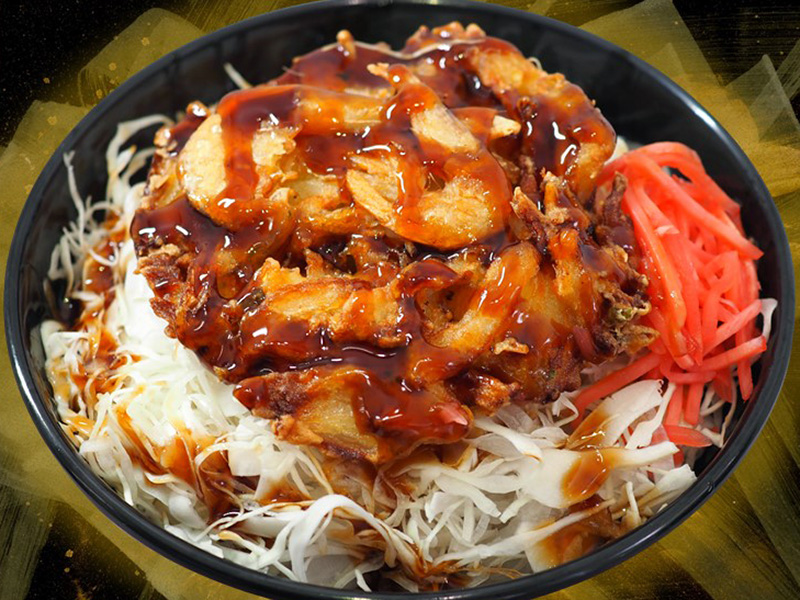 カリッと揚げた富山県産白えびかき揚げを新潟県産コシヒカリを使用した熱々ご飯に乗せました。かき揚げの下にはキャベツを引き、甘辛タレで仕上げました。