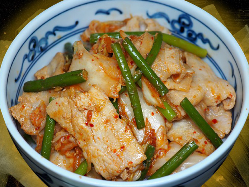 ピリ辛の豚キムチ丼です。にんにくの芽がシャキッとした歯ごたえでご飯が進むどんぶりです。ご飯は地元・南魚沼産のコシヒカリを使用。食欲の秋を楽しもう!