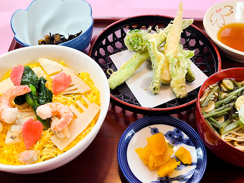 春の山菜を使ったお蕎麦とちらし寿司、旬の食材をてんぷらにしたセットです。