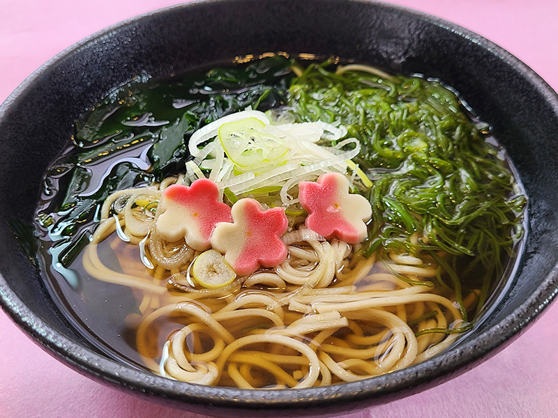 春が旬のめかぶとわかめに春色の花麩を飾ったお蕎麦です。