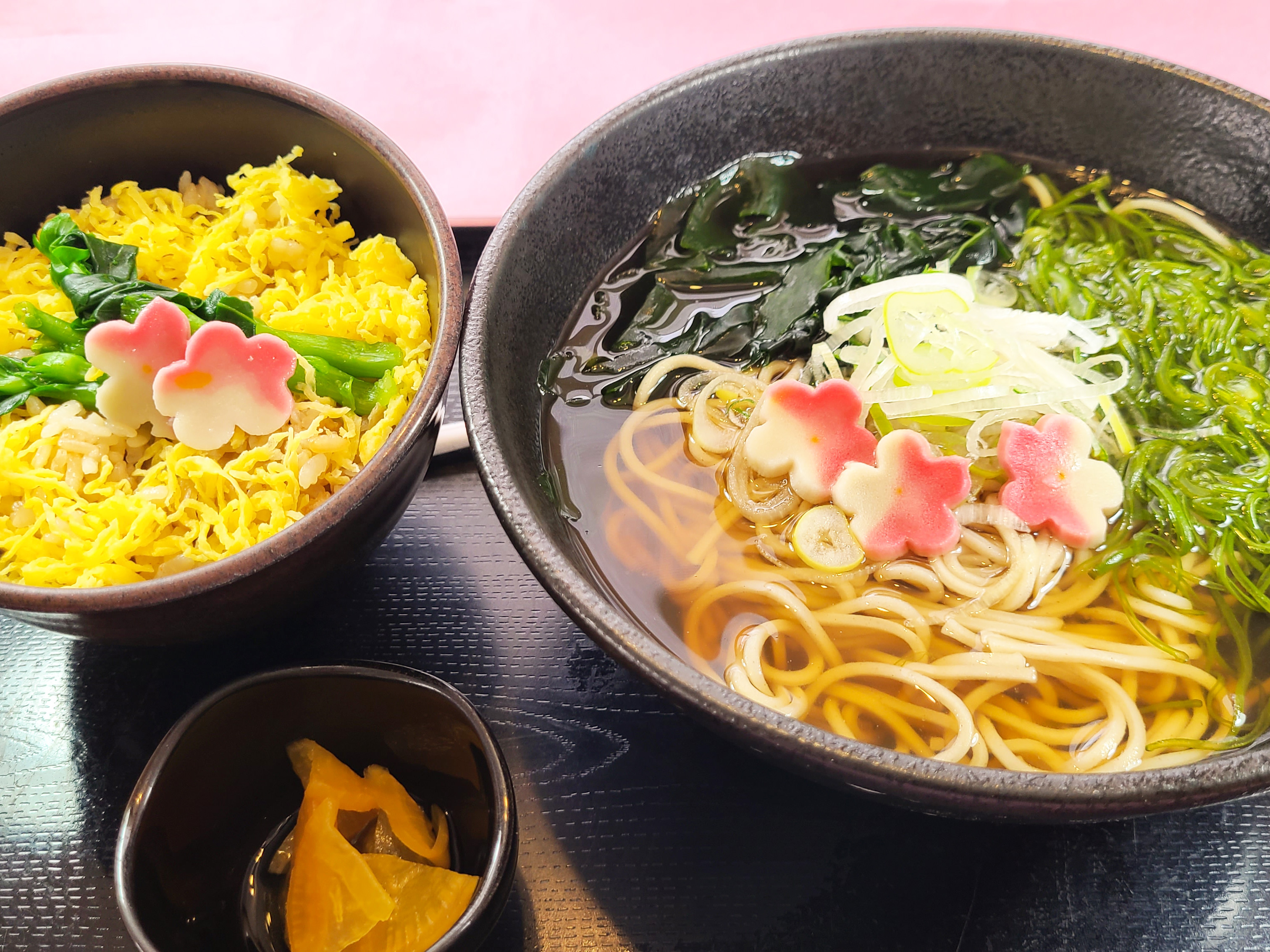 春が旬のめかぶ、わかめに春色の花麩を飾った蕎麦と山菜の炊き込みご飯のセットです。