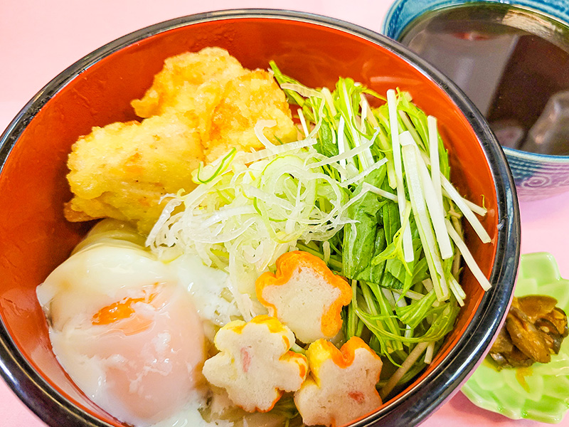 さっくり柔らかなとり天と早咲きの花麩が春を感じさせる。水菜や温泉玉子と絡めて召し上がれ。