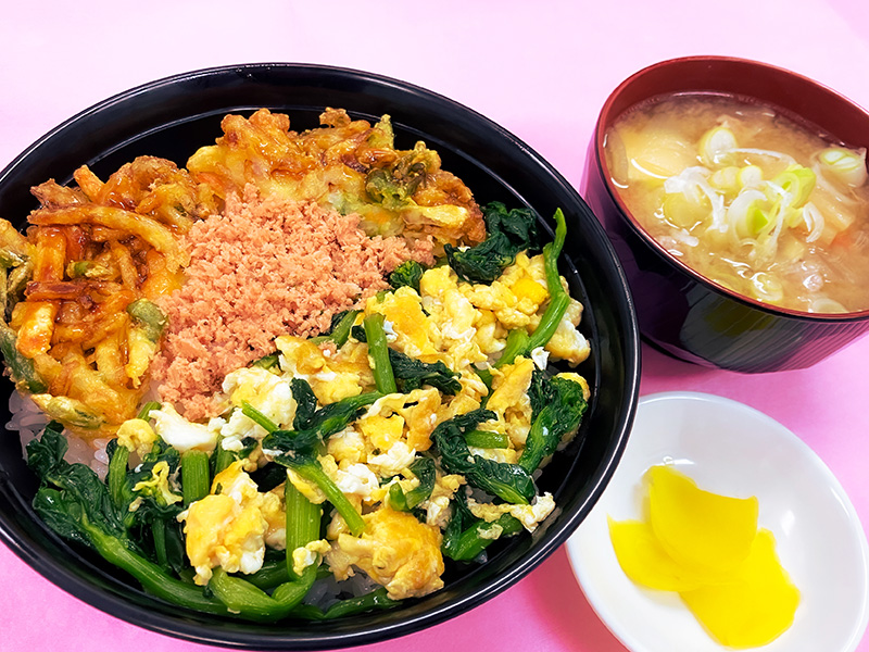 一足早い春の訪れを感じる菜の花をふんだんに使った三色丼ぶりです。鮭が春の彩りをプラス。