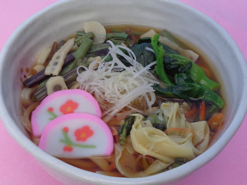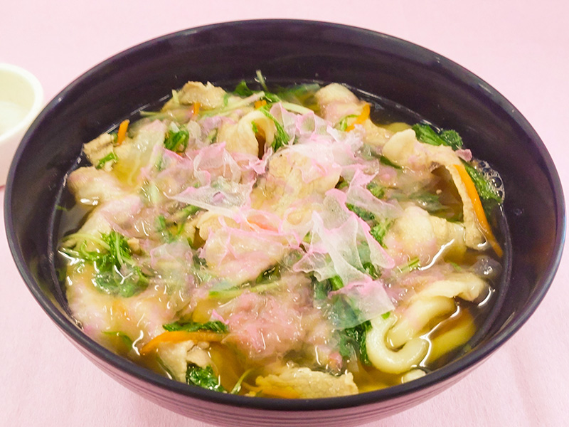 「ハリハリ」食感の水菜と県産白金豚の相性は抜群!削りかまぼこも載せて春の彩り。(画像はうどん)