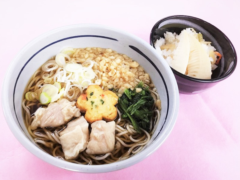 春の食材竹の子の炊き込みご飯と鶏肉、花型の豆腐をトッピングしたそばのセットメニュー。