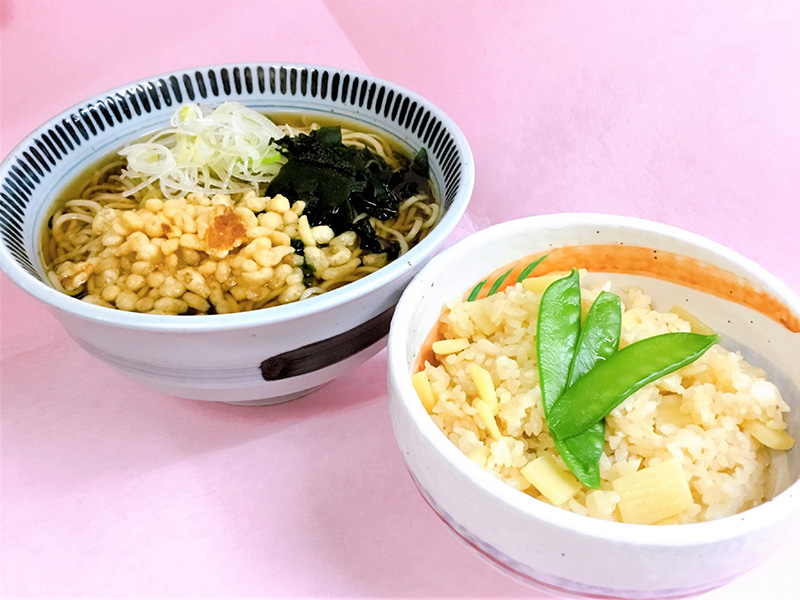 春のおいしさ『たけのこごはん』と花そば(うどん)をセットにしました。旬のたけのこの香り、食感をお楽しみいただける人気メニューです。