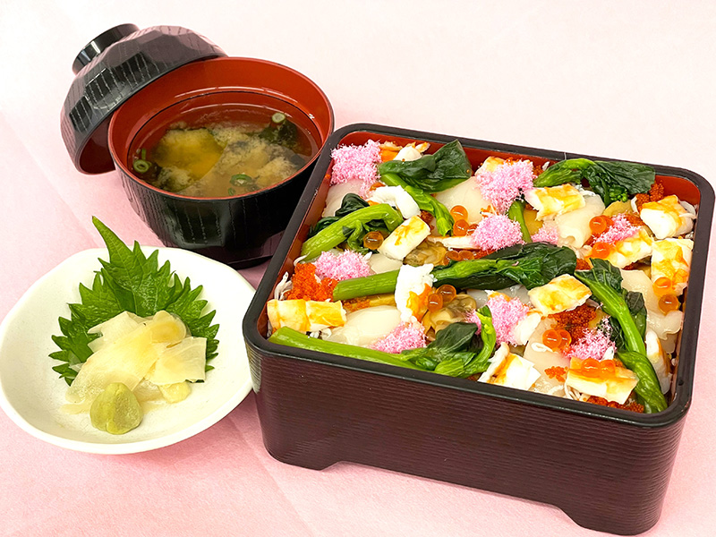 春の食材を使用した彩り鮮やかな「春ちらし重」です。菜の花、海鮮具材の計10種類を散りばめた、彩り鮮やかな一品。ぜひご堪能下さい。