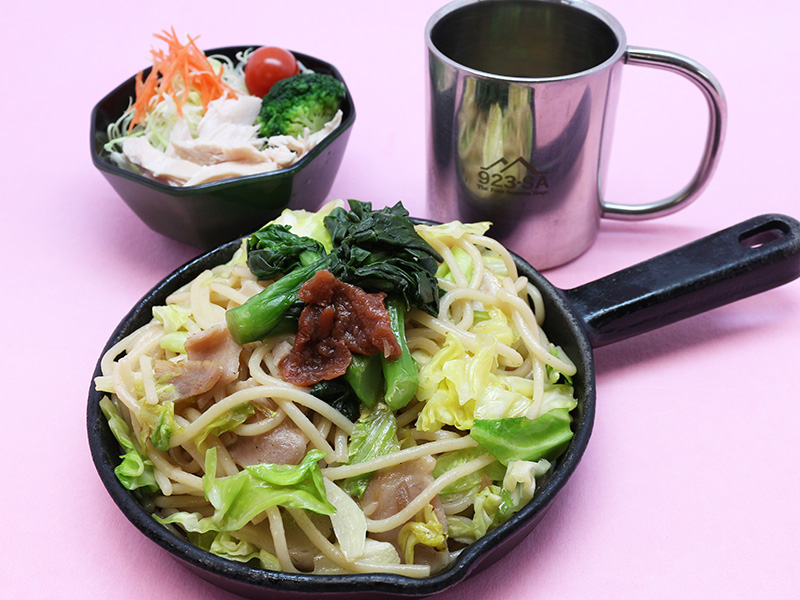 菜の花と梅干しをトッピングして、あっさり梅だれで仕上げたパスタです。春の香りを感じて下さい。
