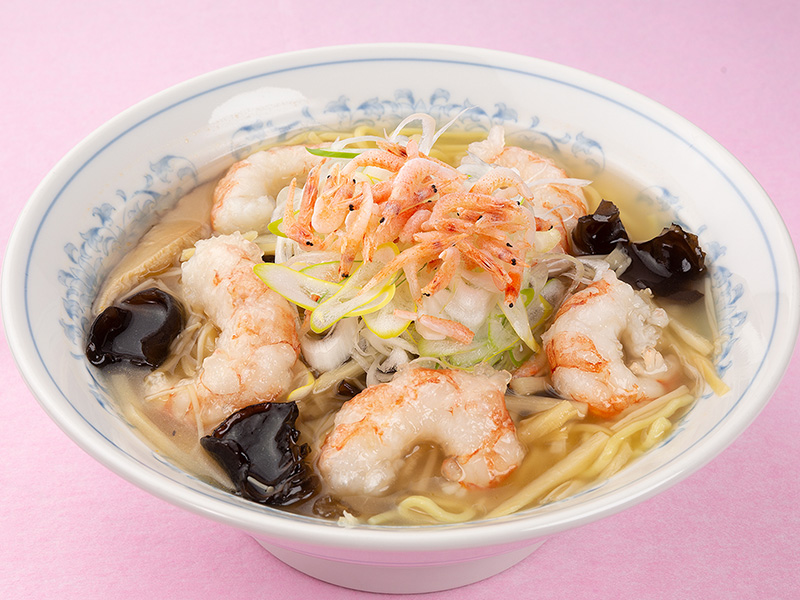 大きめの海老が5個・トッピングにサクラエビを散らした塩ラーメンです。