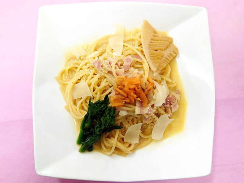 春の食材【(和風の下味を付けた)菜の花・たけのこ】【(燻製した)桜えび】を使用し、豆乳でヘルシーに仕上げた、カルボナーラです。