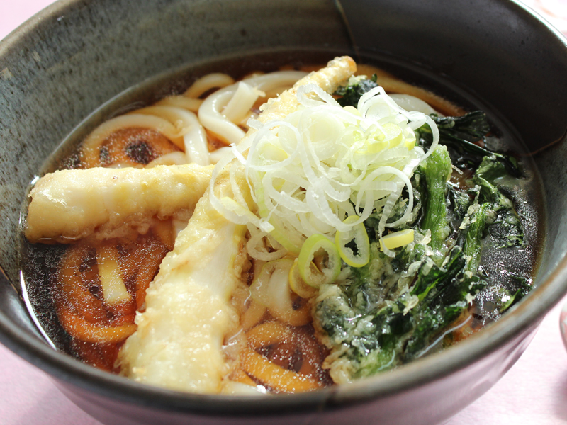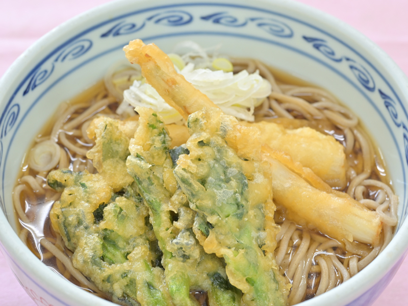 旬の食材「菜の花」と「ひめたけ」のサクサク天ぷらをそば(うどん)にトッピング。春の味覚をどうぞ!