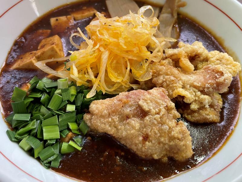 四川風に仕上げたピリ辛のあんが特徴の麻婆豆腐ラーメンに揚げたてサクサクのザンギをのせた、寒い冬にピッタリの一杯。