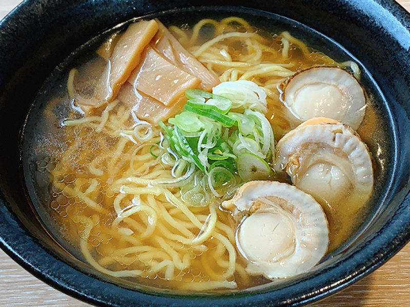 あっさりしつつも豊かな旨味を感じる塩スープに、噴火湾産の帆立を乗せたラーメン。ネギ油の香ばしい風味は食欲をそそる。