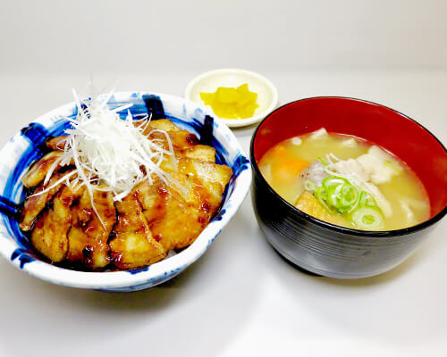 北海道の自然が育てた笹豚(バラ)を当店自慢のタレで絡めている一品。具だくさん野菜たっぷりの手作り豚汁がついてボリューム満点。