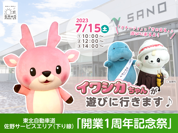 2023年7月15日(土)イワシカちゃんが、佐野ブランドキャラクター『さのまる』、NEXCO東日本「HEARTFUL HIGHWAY」キャラクター『マナーティ』と一緒に、ご来場のみなさまをお迎えします。