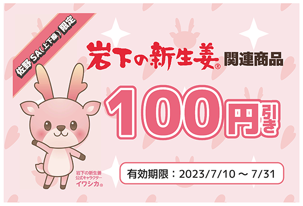 期間中にコラボメニューをご注文のお客様に、佐野SA(上下線)ショッピングコーナーにてパッケージに「岩下の新生姜」の表示がある関連商品やグッズをお買い上げの際に使える100円割引券をプレゼントいたします。
