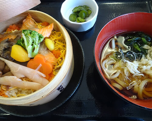 鮭のわっぱ飯とうどんのセット岩下の新生姜添え