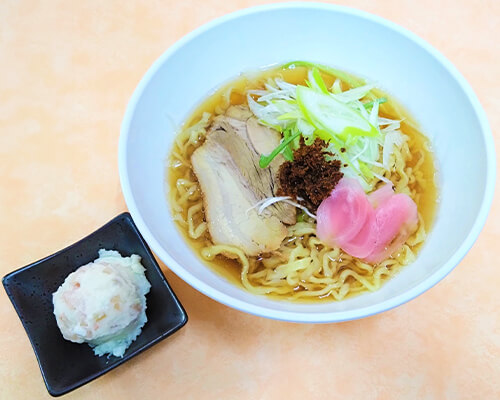 当店特製の佐野ラーメンに『かつおと生姜の浅炊き』と『岩下の新生姜』をトッピング。浅炊きをスープに混ぜたり、新生姜と一緒に食べたり、味の変化をお楽しみください。お口直しには、『岩下の新生姜』入りポテトサラダをどうぞ!