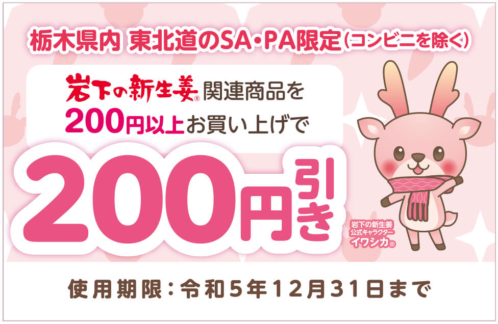 期間中にコラボメニューをご注文のお客様に、ショッピングコーナーにて岩下の新生姜関連商品を200円以上お買い上げの際に使える200円割引券をプレゼントいたします。