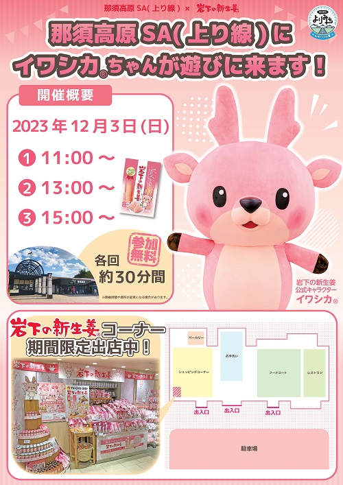 2023年12月3日(日)、岩下の新生姜公式キャラクター「イワシカ®」ちゃんが東北自動車道・那須高原SA(上り線)に遊びにきます!