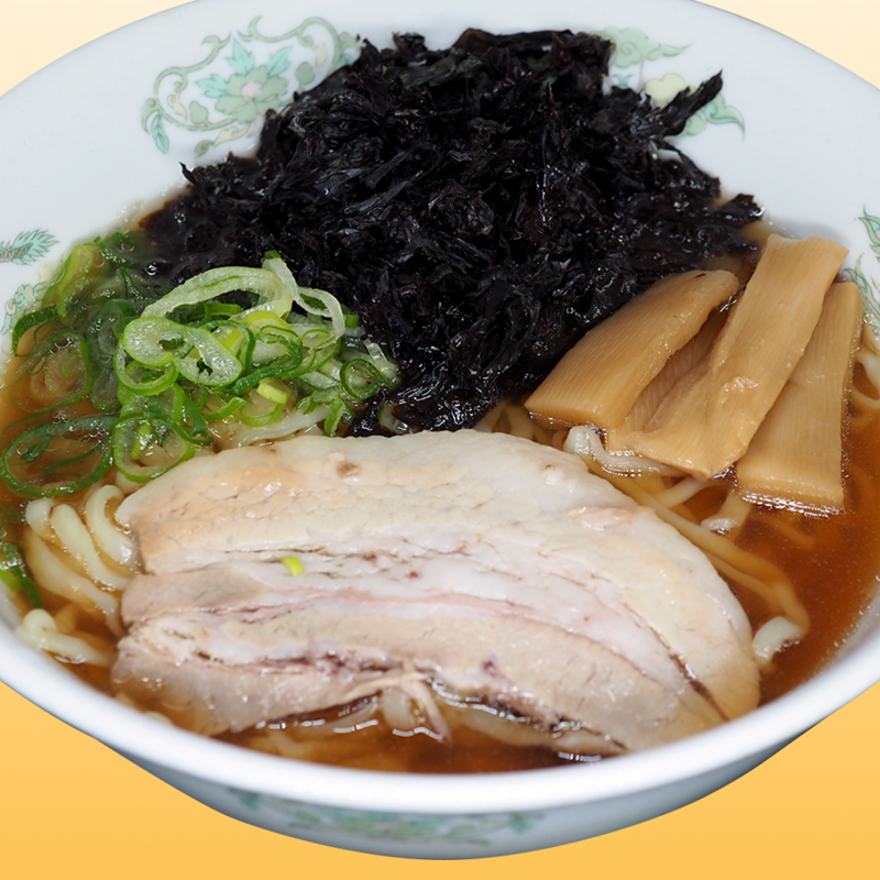 磯の風味豊かな黒ばらのりをたっぷりと使った贅沢な一杯。平打ち麺とあっさりとした醤油スープが食欲をそそる!