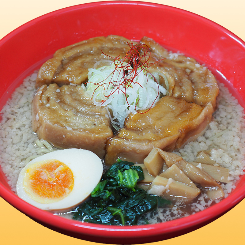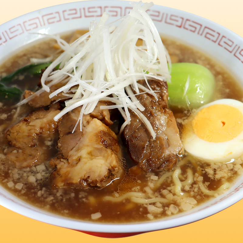 煮豚を厚切りにカットし、一番人気の醤油ラーメンにトッピング!柔らかな煮豚をお楽しみください。