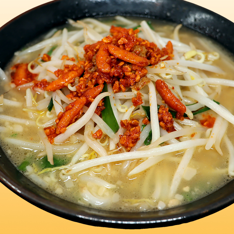 ごろごろチキンとたっぷりのもやしを載せ、ボリューム満点!にんにく香る「男のクレイジーパウダー」入りで爆食必須!