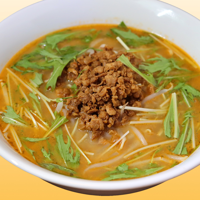 辛口の坦々麺に、今流行りのマルコメの大豆ミートを使用。大豆とは思えない新感覚の大豆ミートを是非ご賞味ください!