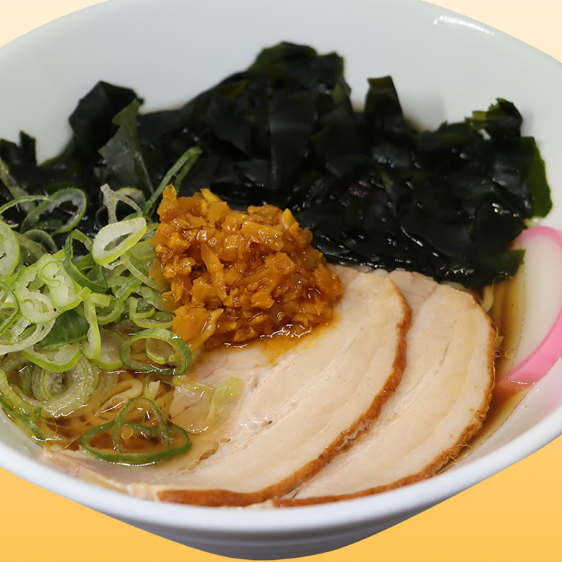 シンプルな醤油ラーメンにラー油漬けの刻み生姜をトッピング。マイルドな味わいで万人受け間違いなし!