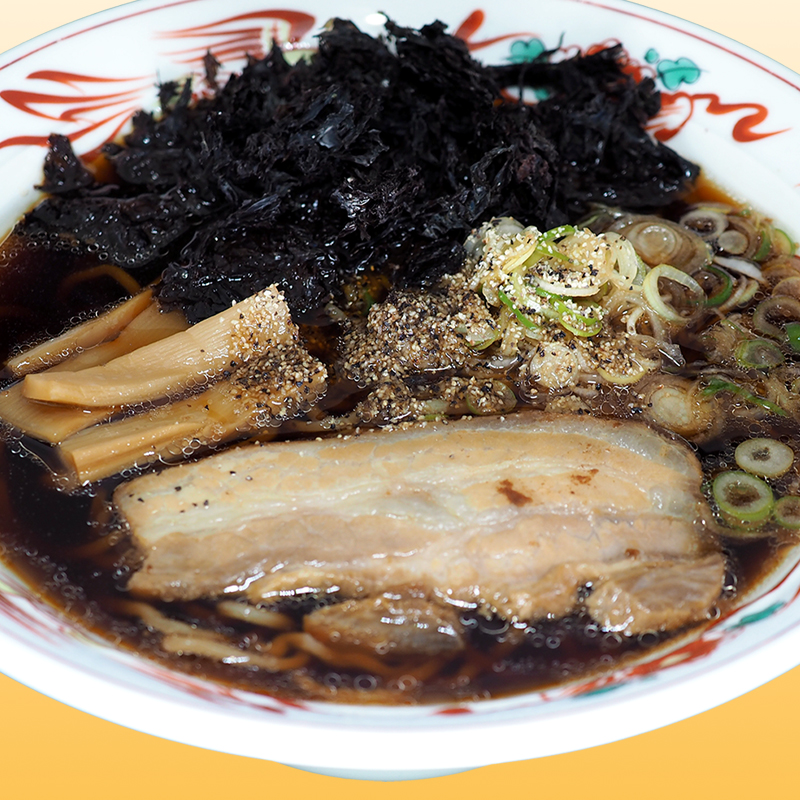 黒醤油スープに黒い磯のりを載せた黒づくしの一杯!黒胡椒にんにくが入った「男のクレイジーパウダー」で旨味倍増!