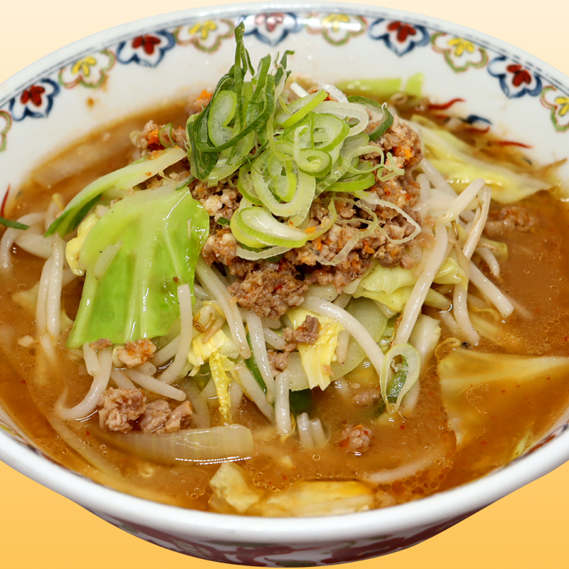 炒めたもやしとニラをたっぷりと載せた味噌ラーメン。もやしとニラの香ばしさと、柿の種のピリ辛食感がクセになる!