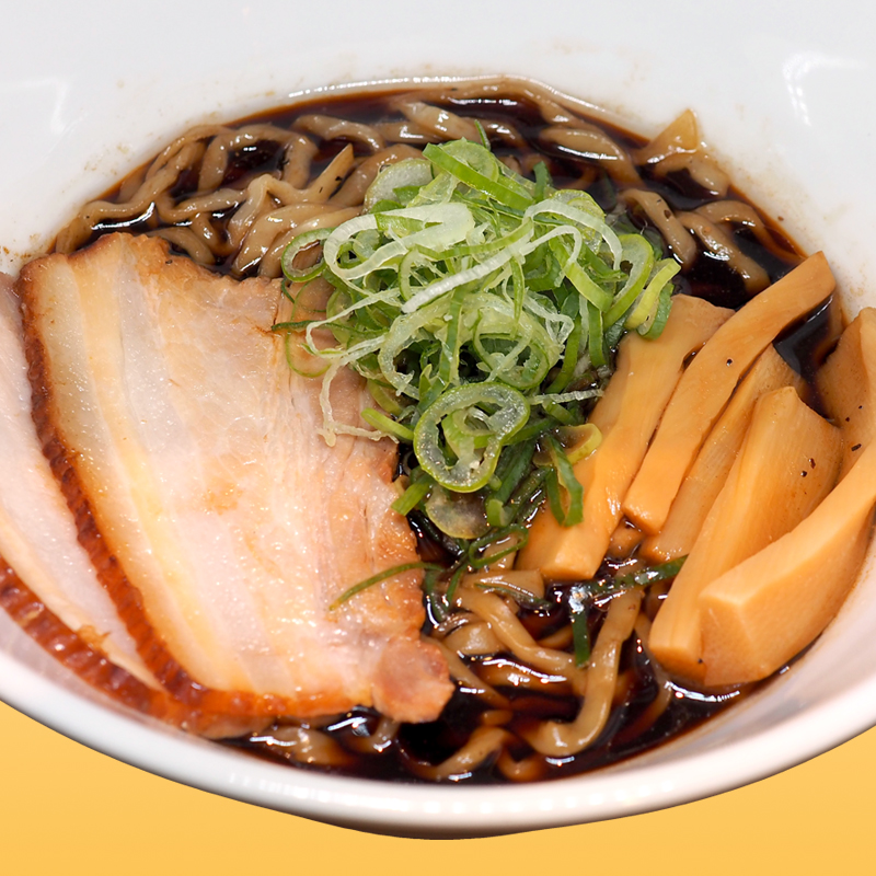 富山県の有名店「麺家いろは」のブラックラーメンスープを使用。キレの良さと深いコクがある黒醤油スープは必食です!