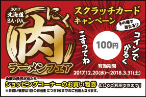 寒い季節に食べるラーメン、温かさが体に染み渡って一層おいしく感じますよね。今回はお肉がたっぷり入ったラーメンメニューをご紹介します。ボリューム満点!冬もスタミナをつけて冬を乗り切りましょう!さらに、対象メニューをご注文のお客さまにショッピングコーナーで使えるお買物券が当たるスクラッチカードをプレゼント!!