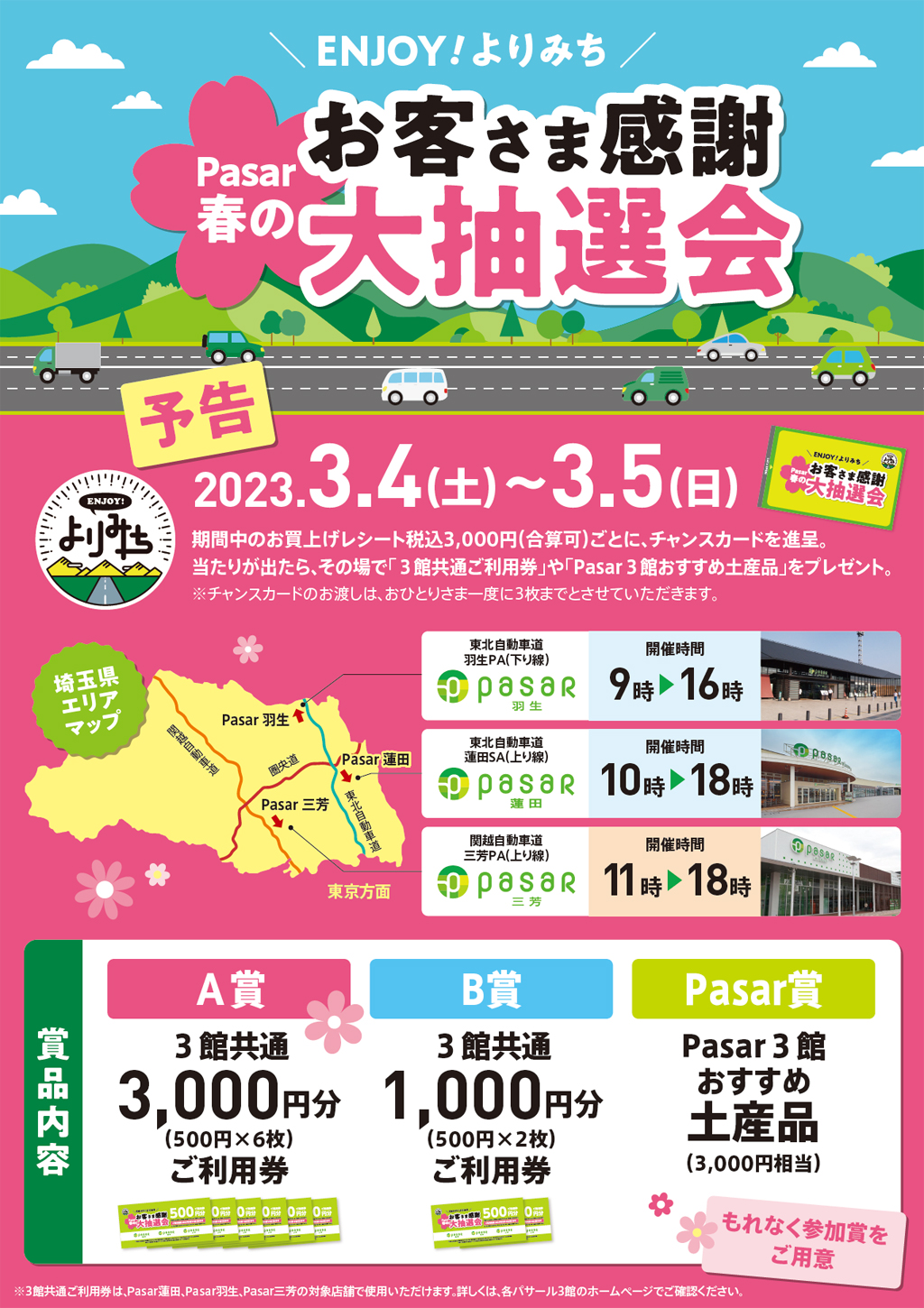 埼玉県内3か所のPasarで、お客さまへの日ごろの感謝を込めてお得な抽選会を開催します。