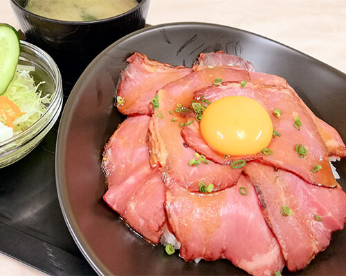 岩手県産のひとめぼれに、やわらかいローストビーフをたっぷりのせました。卵黄と絡めてお召し上がりください。
