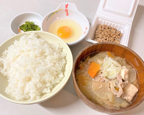 宮城県産のひとめぼれに具だくさんの豚汁、蔵王滋養卵、雌株、納豆の定食です。